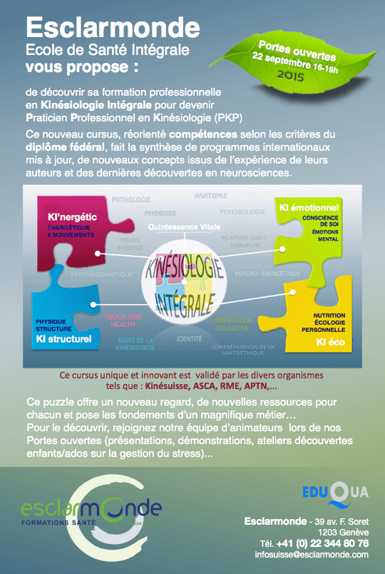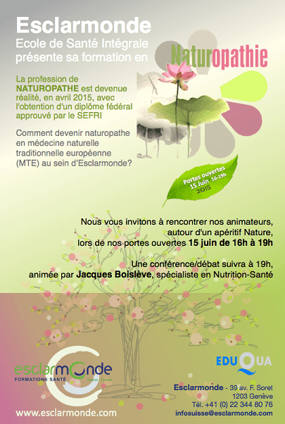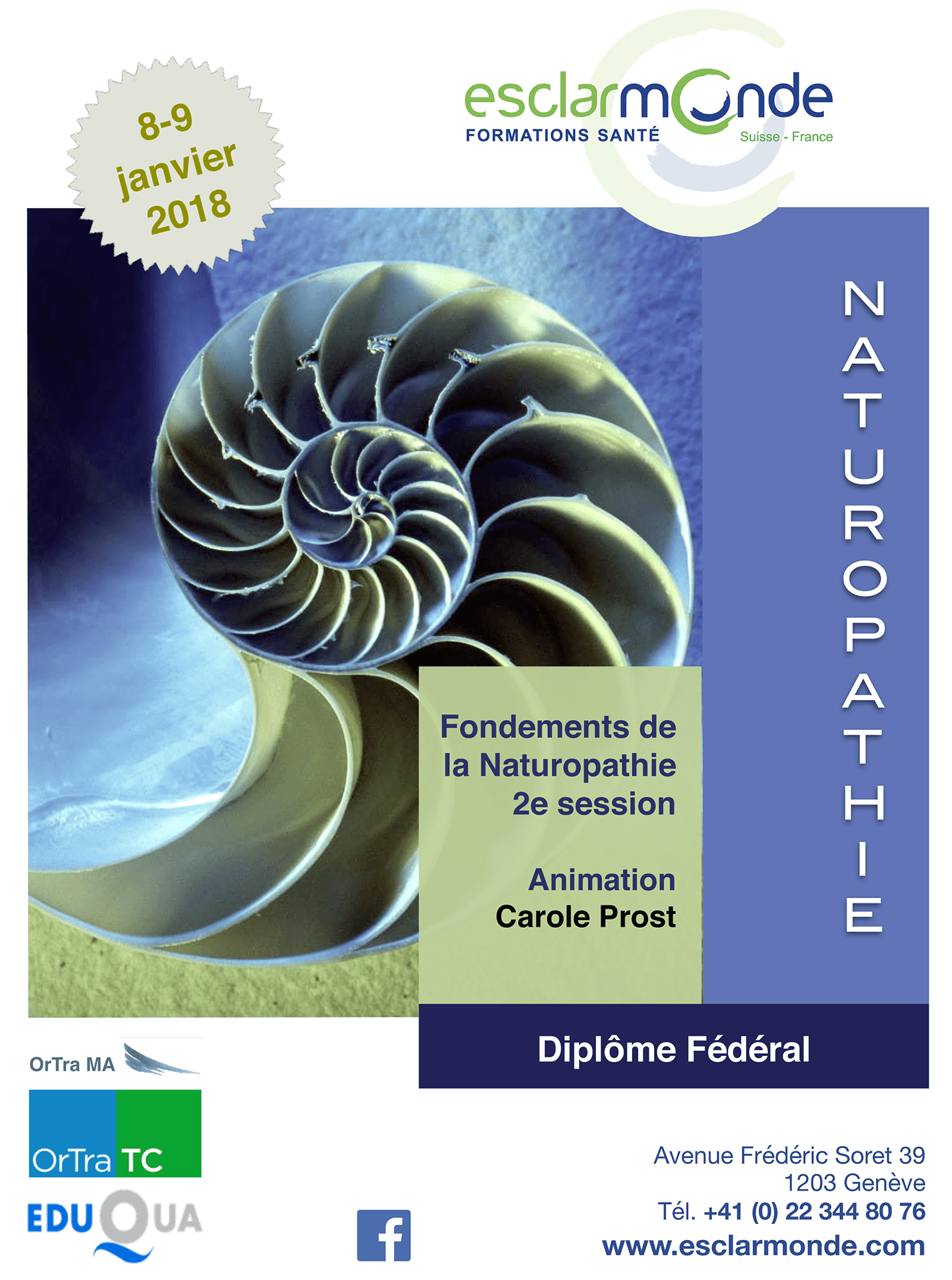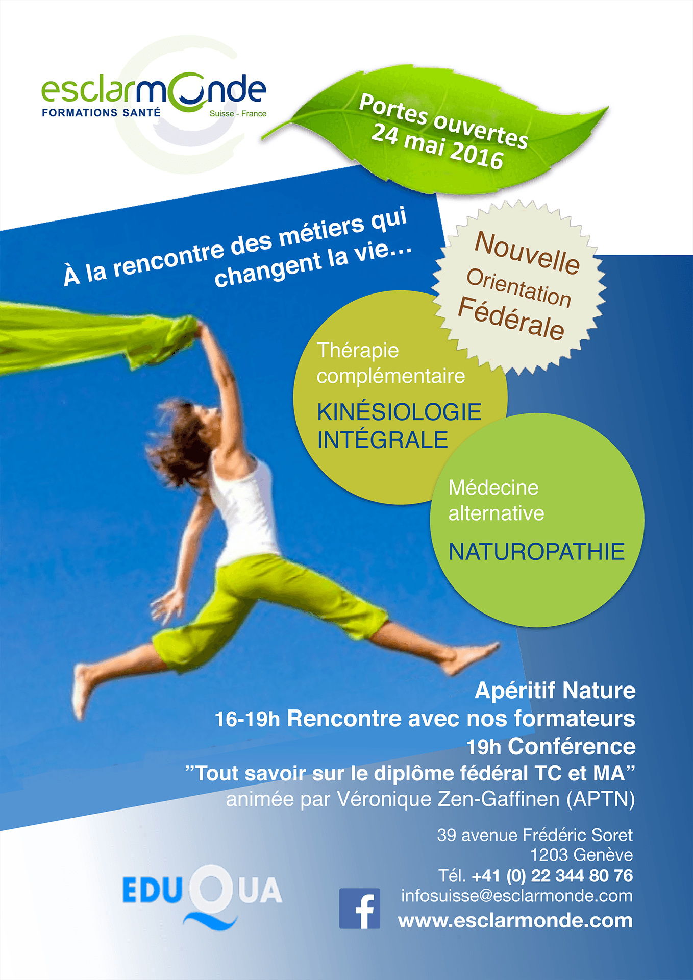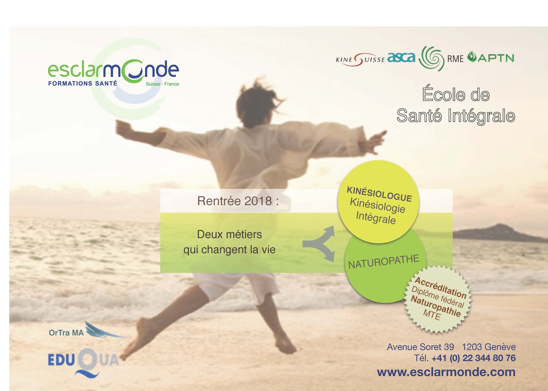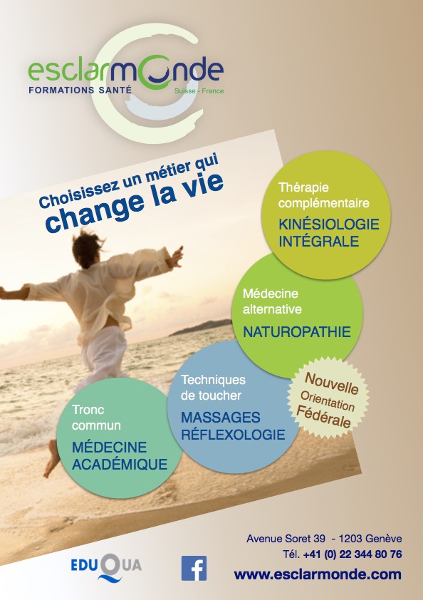 Reconnue par les principaux organismes (ASCA, RME, APTN, Kinésuisse,..) , disposant du label Eduqua et d’une notoriété certaine due aux nombreux thérapeutes formés au sein de notre école et installés professionnellement, Esclarmonde a décidé de rénover et d’enrichir ses divers cursus de formation en les orientant compétences dans la mouvance des divers diplômes fédéraux. A cet égard, nous sommes à ce jour accrédités pour la Naturopathie MTE et d’autres dossiers d’accréditation sont en cours de dépôt.